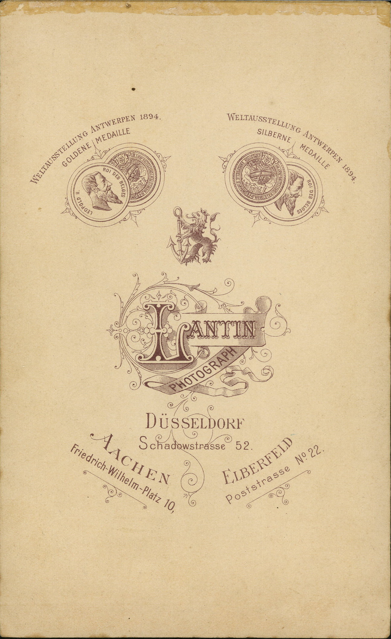 Thom LantinSchadowstraße 52, DüsseldorfFriedrich-Wilhelm-Platz 10, AachenPoststraße 22, ElberfeldDate: front: 1897Cat: 2025-3326